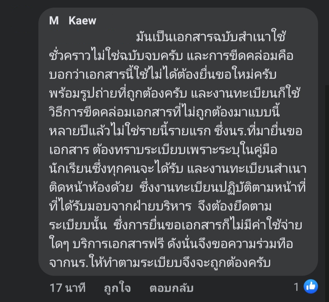 อีกทั้ง ทางคุณครูที่ได้ขีดคร่อมเอกสารปพ.1 ก็ได้ออกมาชี้แจงในประเด็นดังกล่าวว่า “มันเป็นเอกสารฉบับสำเนาใช้ชั่วคราวไม่มใช่ฉบับจบครับ และการขีดคร่อมคือบอกว่าเอกสารนี้ใช้ไม่ได้ต้องยื่นขอใหม่ครับ พร้อมรูปถ่ายที่ถูกต้องครับ และงานทะเบียนก็ใช้วิธีการขีดคร่อมเอกสารที่ไม่ถูกต้องมาแบบนี้หลายปีแล้วไม่ใช่รายนี้รายแรก ซึ่ง นร. ที่มายื่นขอเอกสารต้องทราบรายละเอียดเพราะระบุในคู่มือนักเรียนซึ่งทุกคนจะได้รับ และงานทะเบียนสำเนาติดหน้าห้องด้วย ซึ่งงานทะเบียนปฎิบัติตามหนาที่ ที่ได้รับมอบหมายจากฝ่ายบริหาร จึงต้องยึดตามระเบียบนั้น ซึ่งการยื่นขอเอกสารก็ไม่มีค่าใช้จ่ายใดๆ บริการเอกสารฟรี ดังนั้นจึงขอความร่วมมือจากนักเรียนทำตามระเบียบจึงจะถูกต้องครับ”