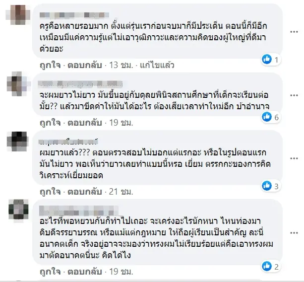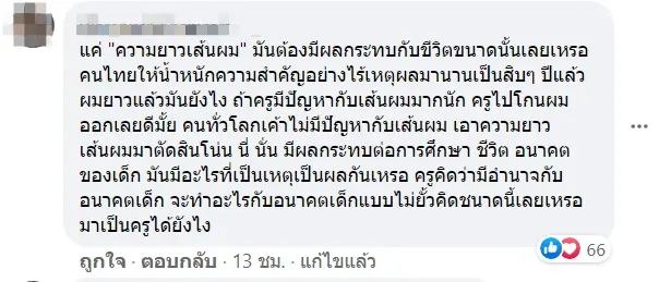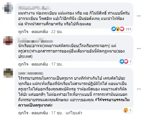 “จรรยาบรรณของความเป็นครูหายไปไหนหมด? สิ่งที่ครูกำลังทำเหมือนเป็นการตัดอนาคตของเด็กเลยนะ ถึงแม้ว่านักเรียนจะผมยาว ครูก็ไม่มีสิทธิ์มาเขียนประจานแบบนี้ ยิ่งเป็นใบ ปพ.1 ยิ่งไม่ควรทำ เพราะนี่เป็นเอกสารสำคัญที่ใช้ในการเรียนต่อ การที่ครูมาขีดเขียนแบบนี้จะทำให้เอกสารฉบับนี้ไร้ค่าลงทันที แล้วถ้าสถานศึกษาที่เด็กจะไปเรียนต่อปฏิเสธ ใครจะเป็นผู้รับผิดชอบ?”