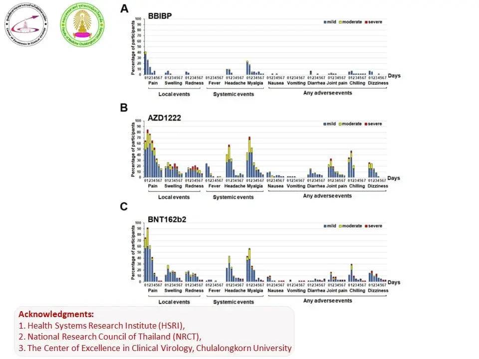 จากการศึกษาของเราจะเห็นว่า การกระตุ้นเข็ม 3 ถ้าใช้วัคซีนเชื้อตายกระตุ้น ภูมิต้านทานจะสูงขึ้นเพียง 1 log หรือประมาณ 10 เท่า แต่ถ้าใช้ AZ จะสูงขึ้นไปประมาณ 2 log หรือเกือบร้อยเท่า ถ้าเป็น mRNA จะสูงขึ้นถึง 200 เท่า เมื่อเปรียบเทียบอาการข้างเคียงของวัคซีนทั้ง 3 ตัวแล้วจะเห็นได้ชัดเจนว่าวัคซีนเชื้อตายมีอาการข้างเคียงน้อยที่สุด ดังแสดงในรูป