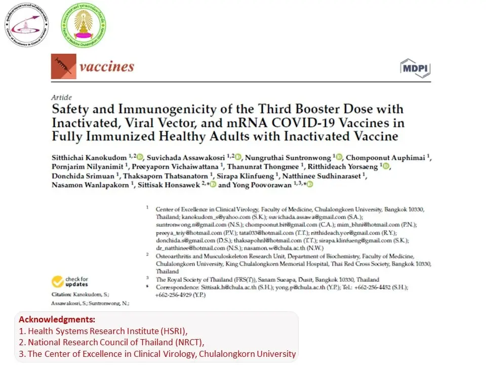 เมื่อวันที่ 15 มกราคม 2565 ทางด้านของ ศ.นพ.ยง ภู่วรวรรณ หัวหน้าศูนย์เชี่ยวชาญเฉพาะทางด้านไวรัสวิทยา คลินิกภาควิชากุมารเวชศาสตร์ คณะแพทยศาสตร์ จุฬาลงกรณ์มหาวิทยาลัย โพสต์ข้อมูลที่เกี่ยวข้องกับวัคซีนโควิด-19 ผ่านทางเฟซบุ๊กส่วนตัว Yong Poovorawan เผยถึงข้อมูล การกระตุ้นเข็ม 3 ด้วยวัคซีนชนิดต่างๆ หลังให้เชื้อตายครบ 2 เข็ม ซึ่งเป็นข้อมูลการศึกษาวิจัยของศูนย์ เห็นได้ชัดเจนและได้รับการลงพิมพ์ในวารสาร