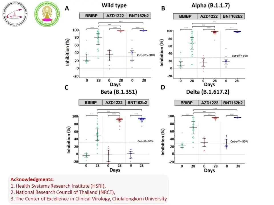 การให้วัคซีนเชื้อตายครบ 2 เข็ม เป็นการปูพื้นที่ดีมาก เพื่อการกระตุ้นเข็ม 3 ด้วยวัคซีน Virus Vector (AZ) หรือ mRNA (PZ) เราจะเห็นว่าการกระตุ้นภูมิต้านทานขึ้นได้สูงมาก ขึ้นสูงถึง 2 log scale หรือประมาณ 100 เท่า และภูมิต้านทานดังกล่าว สามารถขัดขวางสายพันธุ์ แอลฟาและเดลต้าได้เป็นอย่างดี นอกจากนี้การศึกษาระดับเซลล์ CMIR ก็พบว่ามีการตอบสนองที่ดี ขณะนี้ได้มีการศึกษาจากต่างประเทศตามมาอีกเป็นจำนวนมาก ที่ลงพิมพ์ใน MedRxiv โดยทีมยุโรปและจีน ที่ศึกษา การกระตุ้นด้วย mRNA ตามหลังวัคซีน Sinovac มีการกระตุ้นที่สูงมากเช่นเดียวกับของเรา