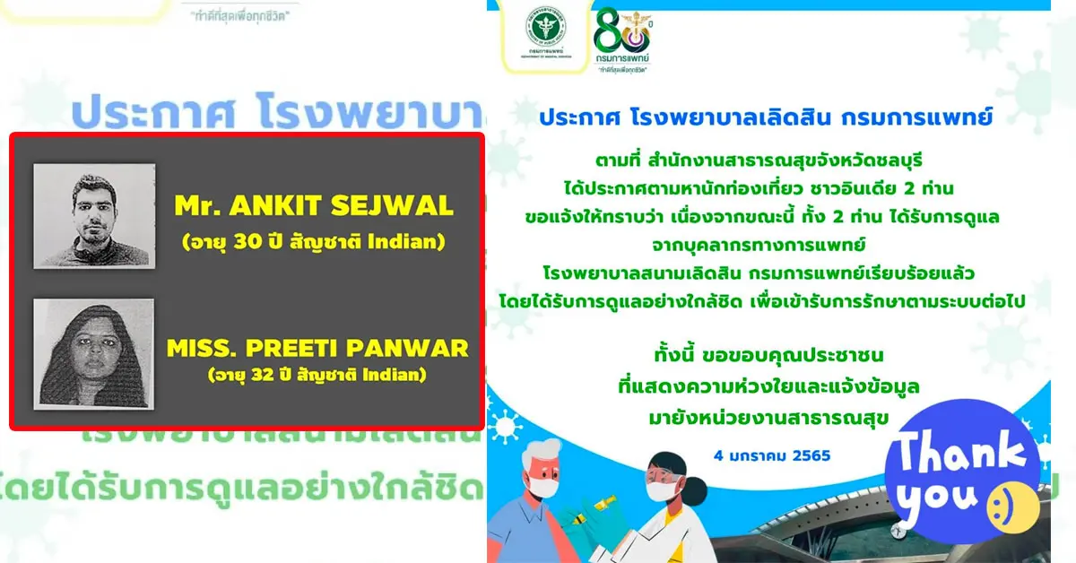 สืบเนื่องจากกรณีของ 2 นักท่องเที่ยวชาวอินเดีย Mr. ANKIT SEJWAL อายุ 30 ปี สัญชาติ อินเดีย และ MISS. PREETI PANWAR อายุ 32 ปี เดินทางเข้ามาไทยในระบบ TEST & GO ซึ่งการตรวจหาเชื้อโควิด ในครั้งแรกไม่พบเชื้อ ต่อมาตรวจหาเชื้อครั้งที่ 2 ด้วยวิธี RT-PCR ผลออกมาเป็นบวก โดยยังไม่ระบุสายพันธุ์ แต่ทั้ง 2 คน ไม่ได้อยู่รอฟังผล และเดินทางเข้ากรุงเทพฯ ซึ่งทางสำนักงานสาธารณสุขจังหวัดชลบุรี โพสต์ประกาศตามหาเรื่องเข้ารับการรักษา