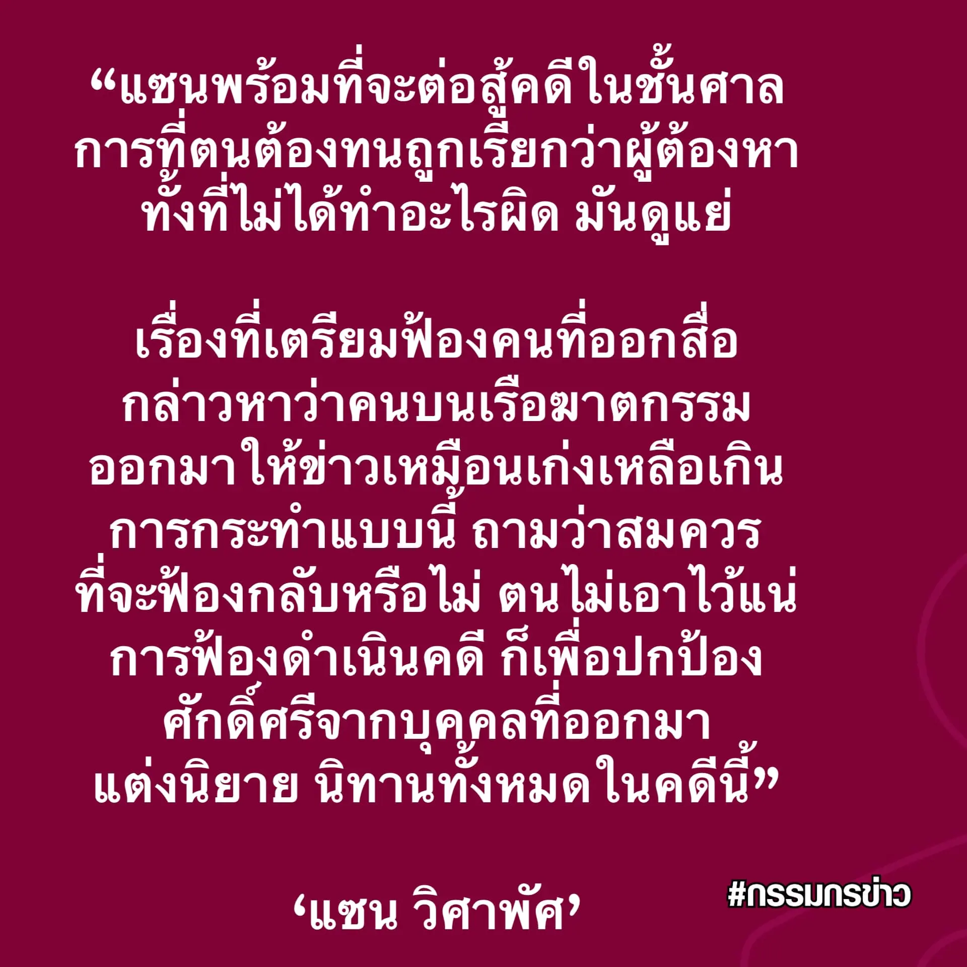 ขณะที่ แซน วิศาพัช ก่อนหน้านั้นตามรายงานจากเฟซบุ๊ก สรยุทธ สุทัศนะจินดา กรรมกรข่าว เผยข้อความของแซน ระบุว่า พร้อมที่จะต่อสู้คดีในชั้นศาล การที่ตนต้องทนถูกเรียกว่าผู้ต้องหา ทั้งที่ไม่ได้ทำอะไรผิด มันดูแย่ เรื่องที่เตรียมฟ้องคนที่ออกสื่อ กล่าวหาว่าคนบเรือฆาตกรรม ออกมาให้ข่าวเหมือนเก่งเหลือเกิน การกระทำแบบนี้ ถามว่าสมควรที่จะฟ้องกลับหรือไม่ ตนไม่เอาไว้แน่ การฟ้องดำเนินคดี ก็เพื่อปกป้องศักดิ์ศรีจากบุคคลที่ออกมาแต่งนิยาย นิทานทั้งหมดในคดีนี้