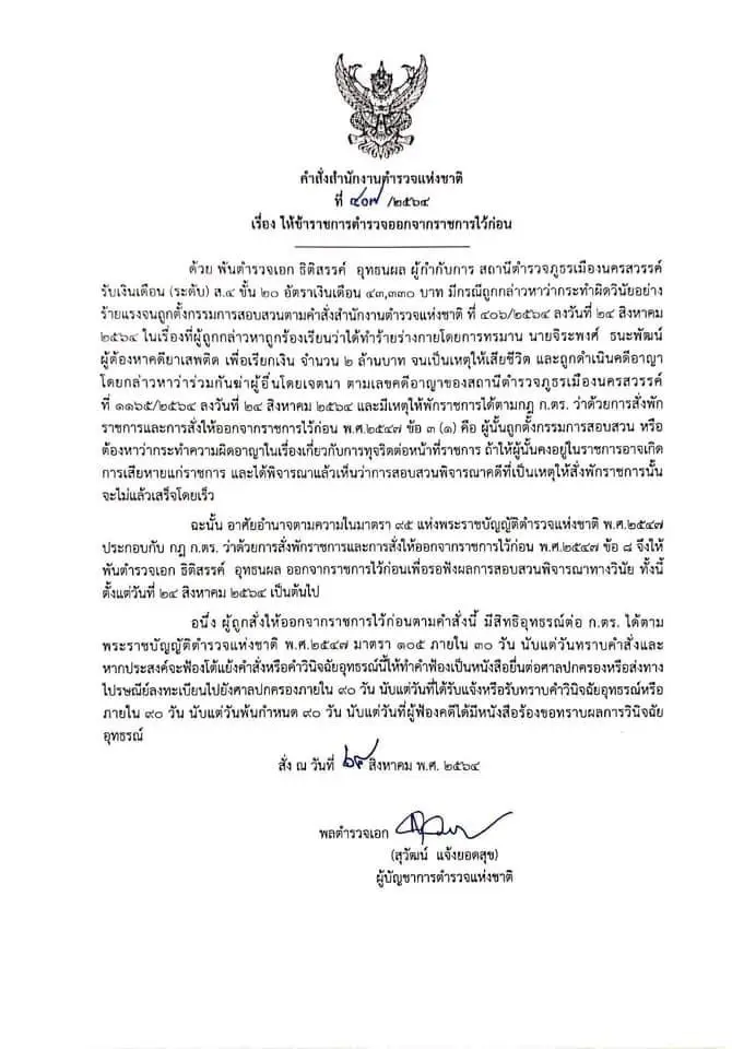 ฉะนั้นอาศัยอำนาจตามความในมาตรา 95 แห่งพระราชบัญญัติตำรวจแห่งชาติ พ.ศ.2547 ประกอบกับกฎ ก.ตร. ว่าด้วยการสั่งพักราชการและการสั่งให้ออกจากราชการไว้ก่อน พ.ศ.2547 ข้อ 8 จึงให้พ.ต.อ.ธิติสรรค์ อุทธนผล ออกจากราชการไว้ก่อน เพื่อรอฟังผลการสอบสวนพิจารณาทางวินัย ทั้งนี้ ตั้งแต่วันที่ 24 สิงหาคม 2564 เป็นต้นไป