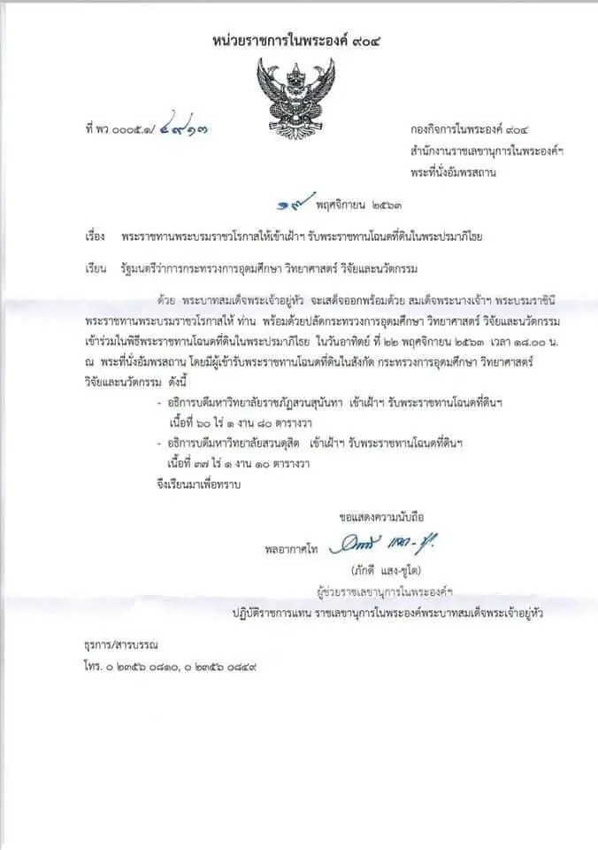 เมื่อวันที่ 20 พ.ย. 63 พลอากาศโทภักดี แสงชูโต ผู้ช่วยราชเลขานุการในพระองค์ฯ ปฏิบัติราชการแทน ราชเลขานุการในพระองค์พระบาทสมเด็จพระเจ้าอยู่หัว ได้ทำหนังสือถึง รัฐมนตรีว่าการกระทรวงการอุดมศึกษา วิทยาศาสตร์ วิจัยและนวัตกรรม ระบุว่า