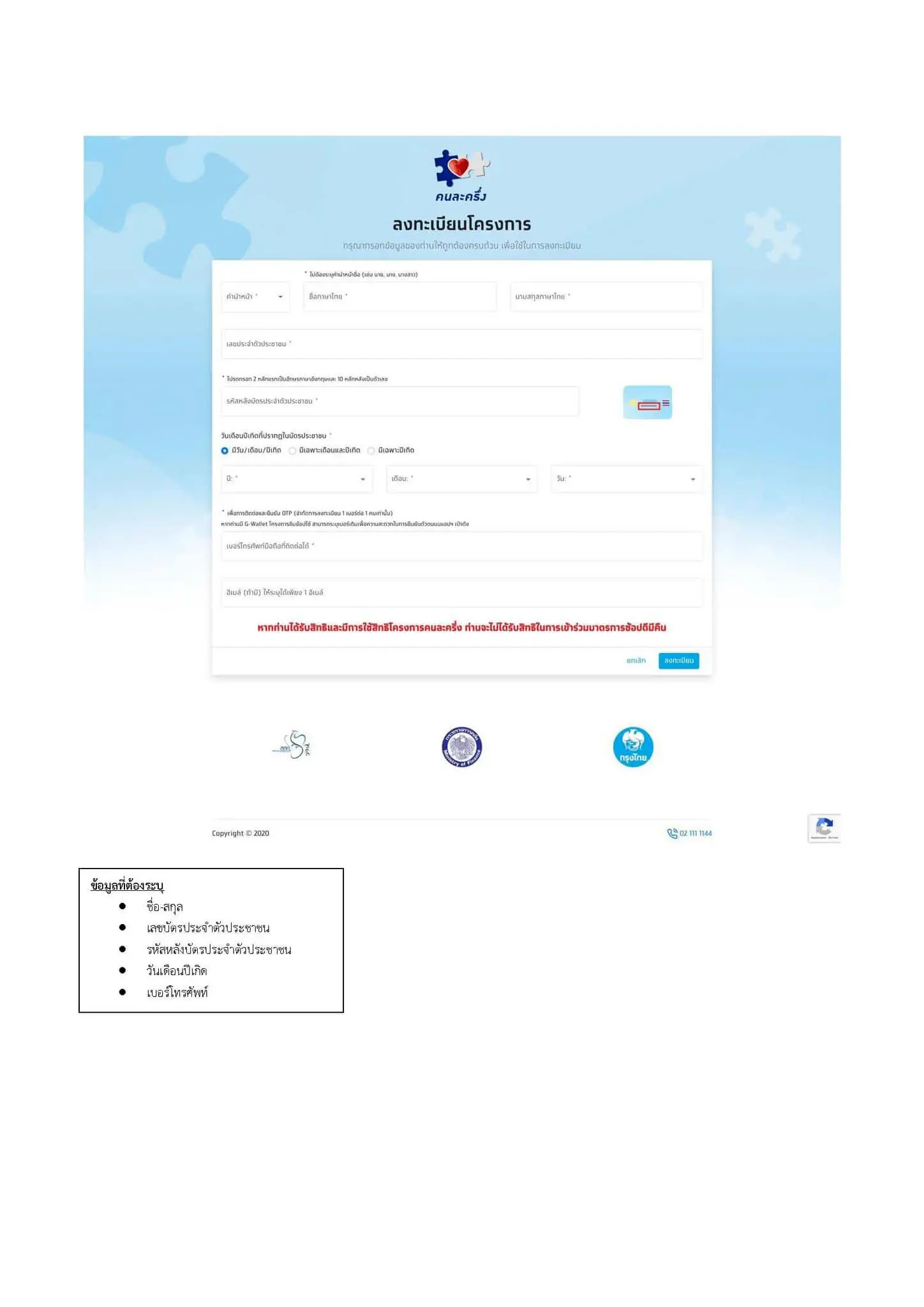 คนละครึ่ง การลงทะเบียนเข้าร่วมโครงการนี้มีขั้นตอนง่ายๆ เพียง 3 ขั้นตอน คือ 1) ลงทะเบียนผ่านเว็บไซต์ www.คนละครึ่ง.คอม โดยกรอกข้อมูลชื่อ-สกุล เลขบัตรประจำตัวประชาชน รหัสหลังบัตรประจำตัวประชาชน วันเดือนปีเกิด และเบอร์โทรศัพท์ที่จะติดตั้งแอปพลิเคชัน “เป๋าตัง” 2) รอรับ SMS แจ้งผลการลงทะเบียน 3) ติดตั้งแอปพลิเคชัน “เป๋าตัง” และยืนยันตัวตน