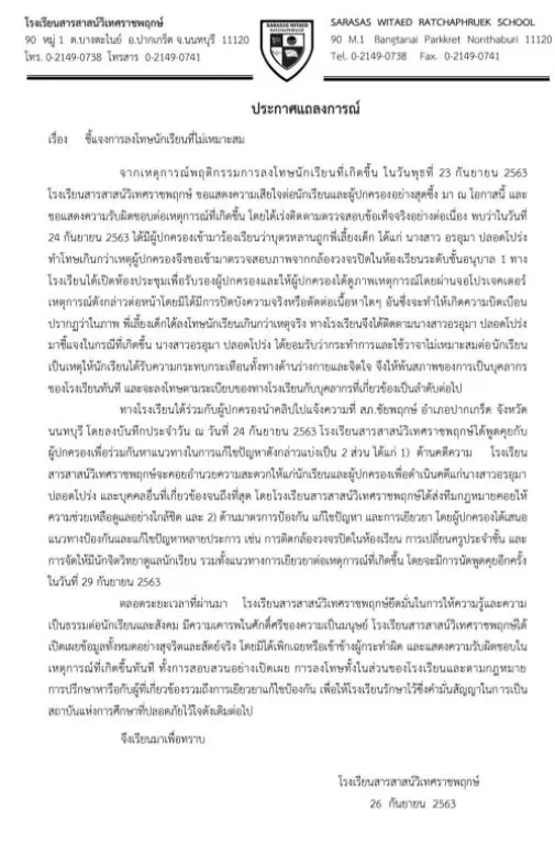 ล่าสุด 26 ก.ย. 63 มีรายงานข่าวว่า โรงเรียนชื่อดังที่กำลังเป็นข่าวได้ไล่ออก ครูจุ๋ม หรือ นางสาวอรอุมา (สงวนนามสกุล) ให้พ้นสภาพของการเป็นบุคลากรของโรงเรียนทันที รวมถึงลงโทษครูประจำชั้น ให้พ้นสภาพของการเป็นบุคลากรของโรงเรียนด้วย ส่วนครูพี่เลี้ยงอีก 2 คนที่อยู่ในเหตุการณ์ จะลงโทษทำทัณฑ์บนและว่ากล่าวตักเตือนต่อไป