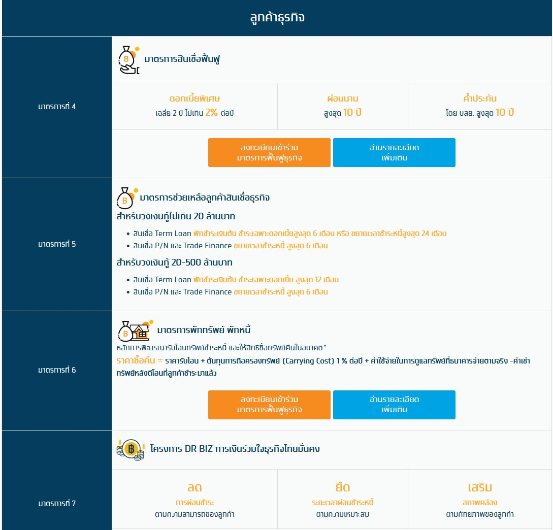 7.โครงการ DR BIZ การเงินร่วมใจธุรกิจไทยมั่นคง ซึ่งจะการผ่อนชำระตามความสามารถของลูกค้า ยืดระยะเวลาผ่อนชำระหนี้ตามความเหมาะสม และเสริมสภาพคล่องตามศักยภาพของลูกค้า