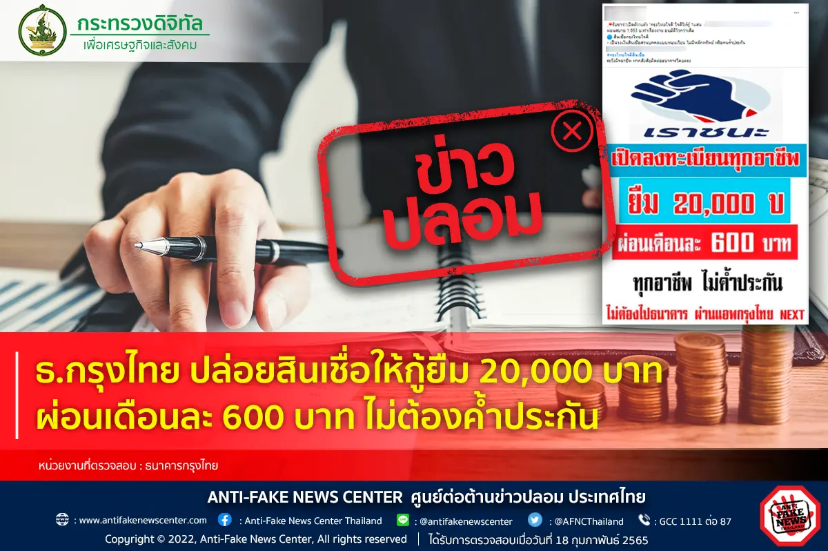 กรุงไทย — เมื่อวันที่ 18 ก.พ. 2565 ศูนย์ต่อต้านข่าวปลอม ประเทศไทยได้โพสต์ข้อความผ่านทางเฟซบุ๊กระบุว่า ตามที่มีการโพสต์และแชร์ข้อความในสื่อต่างๆ เกี่ยวกับประเด็นเรื่อง ธ.กรุงไทย ปล่อยสินเชื่อให้กู้ยืม 20,000 บาท ผ่อนเดือนละ 600 บาท ไม่ต้องค้ำประกัน ทางศูนย์ต่อต้านข่าวปลอมได้ดำเนินการตรวจสอบข้อเท็จจริง ธนาคารกรุงไทย พบว่าประเด็นดังกล่าวนั้น เป็นข้อมูลเท็จ