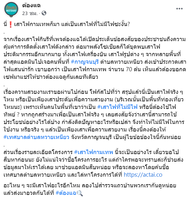 เรื่องความสวยงามเราขอผ่านไปก่อน โฟกัสไปที่ว่า สรุปแล้วนี่เป็นเสาไฟจริง ๆ ไหม หรือเป็นเพียงเสาประดับเพื่อความสวยงาม (บริเวณนั้นเป็นพื้นที่ท่องเที่ยวไหมนะ) เพราะเห็นคนในพื้นที่เขาว่าเป็น #เสาไฟที่ไม่มีไฟ หรือนี่ต้องใช้ไฟทิพย์ ?