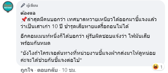 อย่างไรก็ตามทางเพจ ได้ออกมาแสดงความคิดเห็นเพิ่มเติมว่า “ล่าสุดมีคนบอกว่า เทศบาลหวายเหนียวได้ออกมาชี้แจงแล้วว่าเป็นเสาเก่า 10 ปี ชำรุดเสียหายแต่รื้อถอนไม่ได้อีกคอมเมนท์หนึ่งก็ได้บอกว่า ผู้รับผิดชอบแจ้งว่า ไฟมันเสียพร้อมกันหมด”