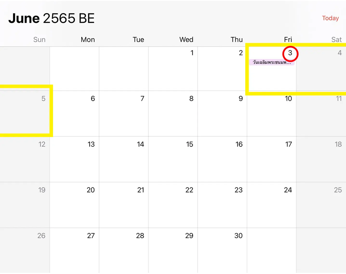 - 3 มิถุนายน 2565 วันเฉลิมพระชนมพรรษาสมเด็จพระนางเจ้าฯ พระบรมราชินี – ซึ่งติดกับวันเสาร์อาทิตย์ ทำให้มีวันหยุดยาว แบบไม่ต้องลา 3 วัน คือตั้งแต่วันศุกร์ที่ 3 ถึงวันอาทิตย์ที่ 5 มิถุนายน 2565