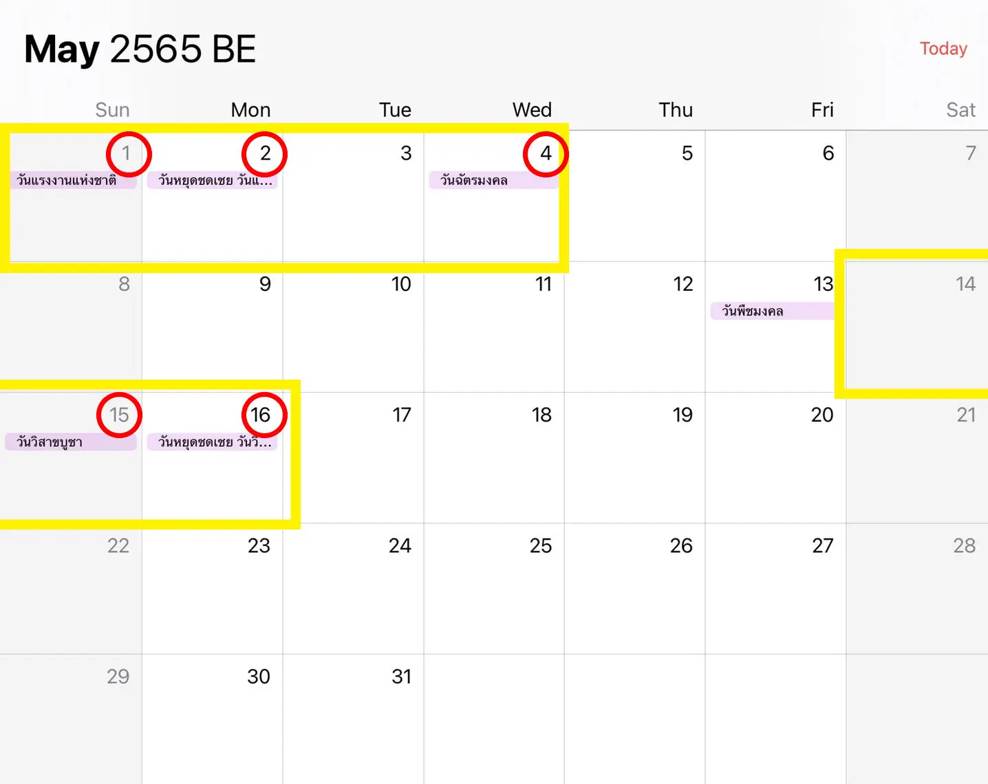 สำหรับกลางเดือนพฤษภาคม 2565 วันวิสาขบูชาและวัดหยุดชดเชยติดกับวันเสาร์อาทิตย์ ทำให้มีวันหยุดยาว แบบไม่ต้องลางาน 3 วัน ตั้งแต่ เสาร์ที่ 14 ถึง จันทร์ที่ 16 พฤษภาคม 2565
