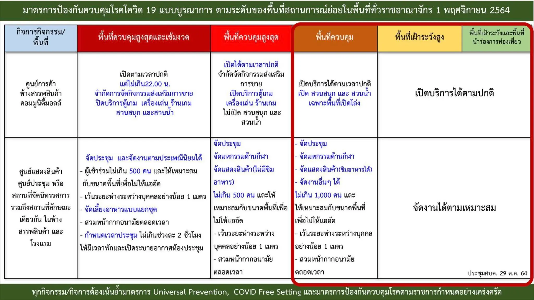 ทั้งพื้นที่ควบคุม, พื้นที่เฝ้าระวังสูง , พื้นที่เฝ้าระวังและพื้นที่นำร่องการท่องเที่ยว ไม่มีการห้ามออกนอกเคหสถาน โดยหน่วยงานของรัฐ ผู้ประกอบการภาคเอกชน ดำเนินการได้ตามความเหมาะสม