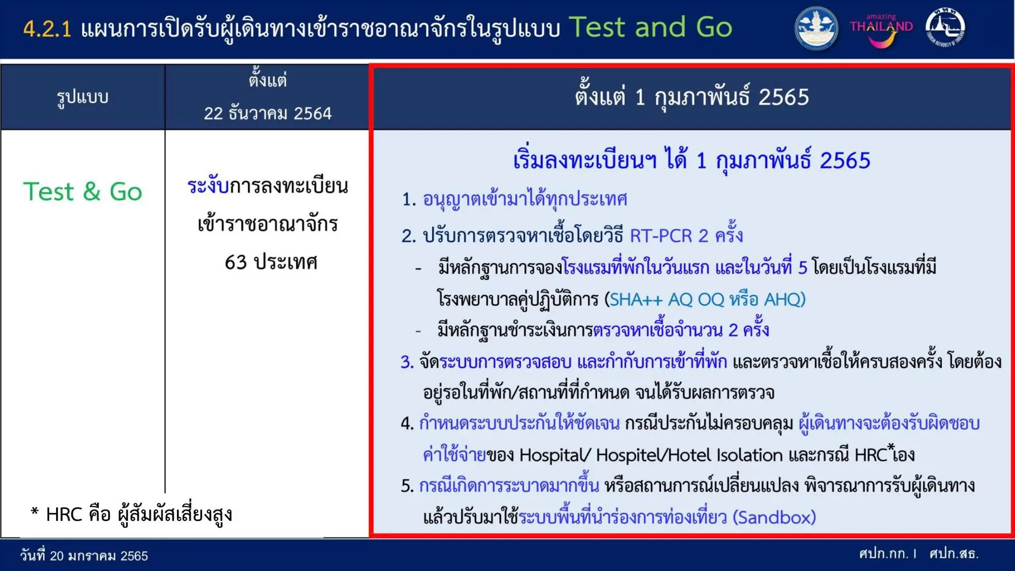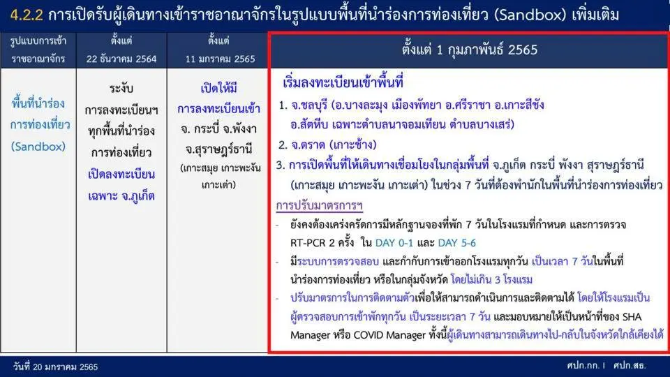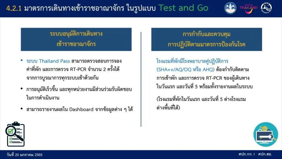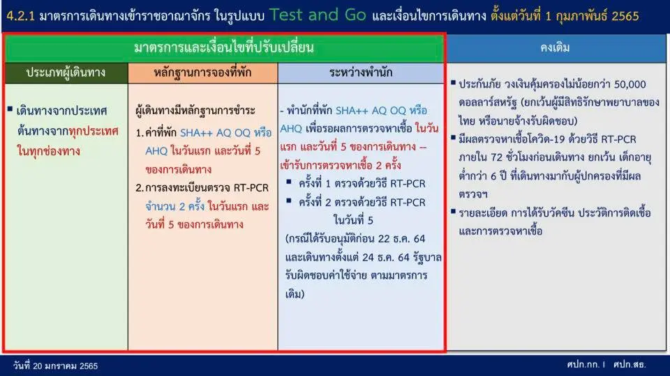 - ยังต้องเคร่งครัดการมีหลักฐานจองที่พัก 7 วัน ในโรงแรมที่กำหนด และการตรวจ RT-PCR 2 ครั้ง ใน DAY 0-1 และ DAY 5-6