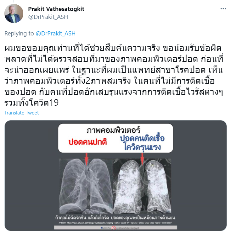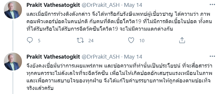 และล่าสุด ศ.นพ.ประกิตได้ทวีตข้อความอีกครั้ง โดยระบุว่า ผมขอขอบคุณท่านที่ได้ช่วยสืบค้นความจริง ขอน้อมรับข้อผิดพลาดที่ไม่ได้ตรวจสอบที่มาของภาพคอมพิวเตอร์ปอด ก่อนที่จะนำออกเผยแพร่ ในฐานะที่ผมเป็นแพทย์สาขาโรคปอด เห็นว่าภาพคอมพิวเตอร์ทั้ง2ภาพสมจริง ในคนที่ไม่มีการติดเชื้อของปอด กับคนที่ปอดอักเสบรุนแรงจากการติดเชื้อไวรัสต่างๆรวมทั้งโควิด19