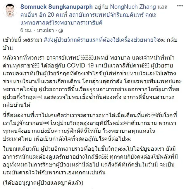 “หลังจากที่พวกเรา อาจารย์แพทย์ แพทย์ พยาบาล และเจ้าหน้าที่หน้าด่านทุกสาขา ได้ต่อสู้กับ COVID-19 มาเป็นเวลาสี่สัปดาห์ ผู้ป่วยรายแรกของเราที่เป็นผู้ป่วยวิกฤตที่ต้องเข้าไอซียูใส่ท่อช่วยหายใจและใช้เครื่องช่วยหายใจมาเป็นเวลาเกือบเดือน โดยสู้จนสุดกำลัง โดยเฉพาะทีมแพทย์และพยาบาลไอซียู ผู้ป่วยอาการดีขึ้นเรื่อยๆจนสามารถย้ายออกจากไอซียูมาที่หอผู้ป่วยกึ่งวิกฤต และตรวจไม่พบเชื้อซ้ำกันสองครั้ง อาการดีขึ้นจนสามารถกลับบ้านได้”