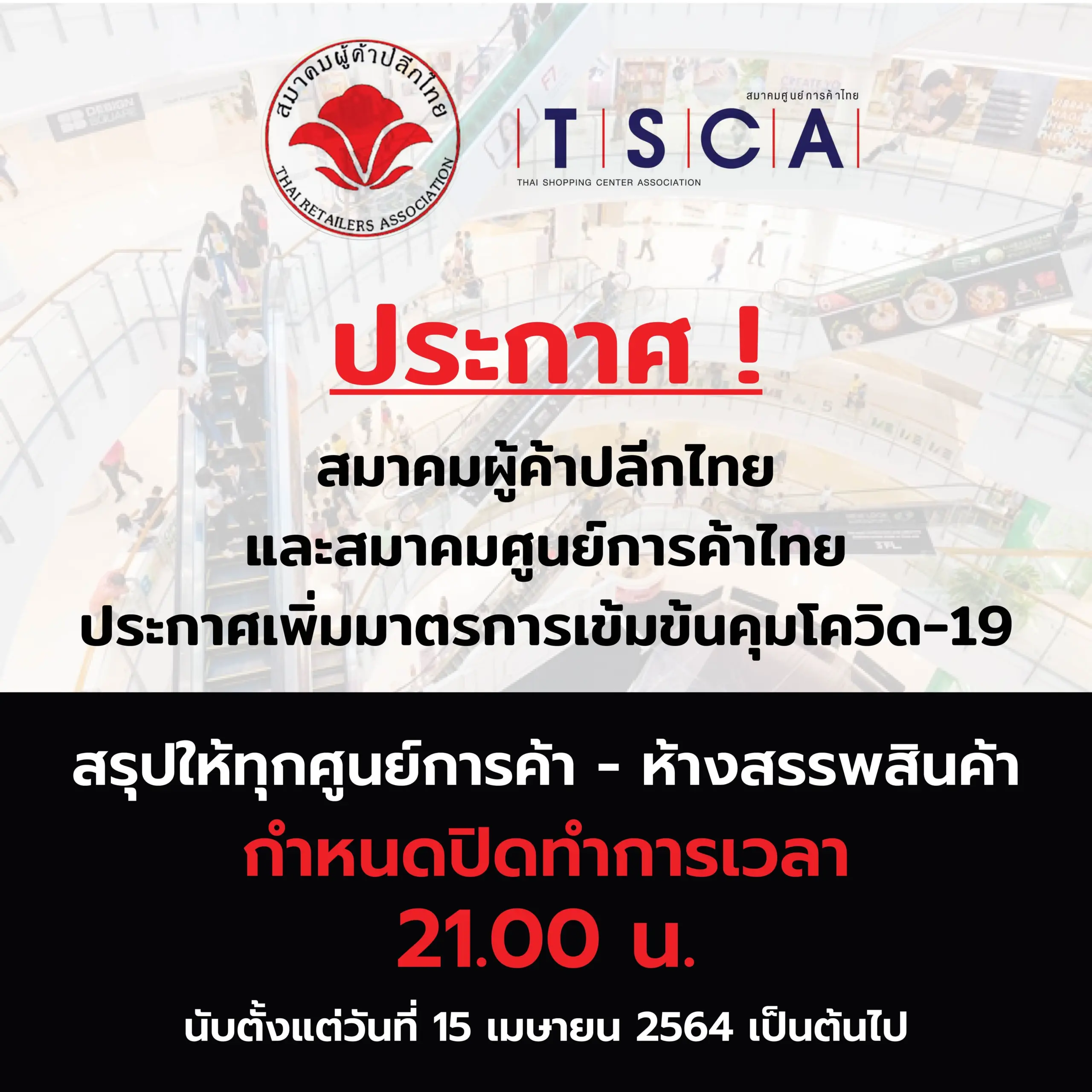 ล่าสุด นายญนน์ โภคทรัพย์ ประธานสมาคมผู้ค้าปลีกไทย แจ้งว่า สมาคมผู้ค้าปลีกไทย และสมาคมศูนย์การค้าไทย ได้ประกาศยกระดับมาตรการการเฝ้าระวังการระบาดของโควิดครั้งนี้ โดยสมาชิกสมาคมทั้ง 2 แห่ง รวมทั้งภาคีเครือข่ายทั่วประเทศ จะเพิ่มมาตรการเข้มข้นในการคัดกรองผู้บริโภคเข้าศูนย์การค้าและห้างสรรพสินค้า ในระดับสูงสุด และประกาศเลื่อนปิดศูนย์การค้าและห้างสรรพสินค้าทั่วประเทศเป็นเวลา 21.00 น. ทุกวัน