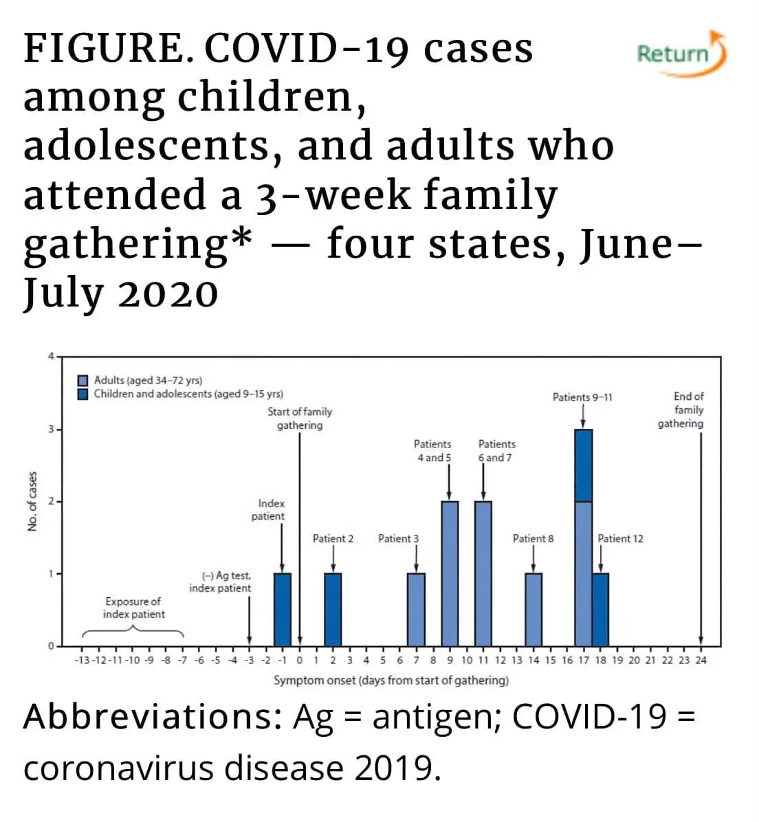 ล่าสุด CDC ของสหรัฐฯออกมาให้ข้อมูลเด็กหญิงอายุ 13 ปี แพร่เชื้อให้น้องชายอายุ 9 ปี พี่ชายอายุ 15 ปี พ่อ แม่ และญาติผู้ใหญ่รวม 11 คน จากคนที่เดินทางมางานรวมญาติ 14 คน พักอยู่ในบ้านเดียวกันที่มี 5 ห้องนอนและ 2 ห้องน้ำ เป็นเวลา 3 สัปดาห์ โดยไม่มีใครสวมหน้ากากและเว้นระยะห่าง