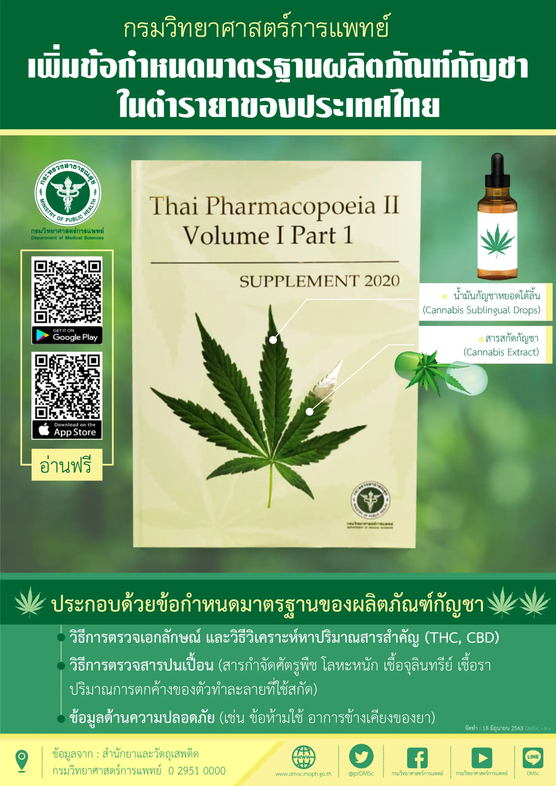 ดังนั้นกรมวิทยาศาสตร์การแพทย์ โดยสำนักยาและวัตถุเสพติด จึงได้จัดทำตำรายาของประเทศไทย ฉบับเพิ่มเติมปี 2020 (Thai Pharmacopoeia II Volume I Part 1 Supplement 2020) ขึ้นมาเพื่อใช้อ้างอิงตามกฎหมาย ซึ่งประกอบด้วยข้อกำหนดมาตรฐานของผลิตภัณฑ์กัญชา จำนวน 2 มอโนกราฟ ได้แก่ สารสกัดกัญชา (Cannabis Extract) และน้ำมันกัญชาหยอดใต้ลิ้น (Cannabis Sublingual Drops) โดยข้อกำหนดมาตรฐานดังกล่าวได้จากการวิจัยและพัฒนาวิธีการตรวจเอกลักษณ์และวิธีวิเคราะห์หาปริมาณสารสำคัญ ทั้งสาร tetrahydrocannabinol (THC) และ cannabidiol (CBD) รวมทั้งการปนเปื้อนจากสารกำจัดศัตรูพืช โลหะหนัก หรือเชื้อรา และปริมาณการตกค้างของตัวทำละลายที่ใช้สกัด (residual solvent) อีกทั้งยังมีข้อมูลด้านความปลอดภัย เช่น ข้อห้ามใช้ อาการข้างเคียงของยา รวมทั้งภาคผนวกที่เกี่ยวข้องจำนวน 42 เรื่อง