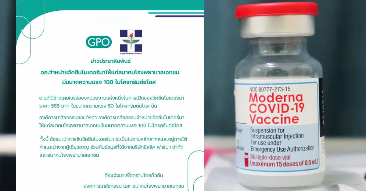 หลังจากมีการเปิดจองวัคซีน โมเดอร์ 50 ไมโครกรัมต่อโดส ของหน่วยงานหนึ่ง ทางด้าน อภ.แจงว่า ได้จำหน่ายในขนาด 100 ไมโครกรัมต่อโดสให้รพ.เอกชน