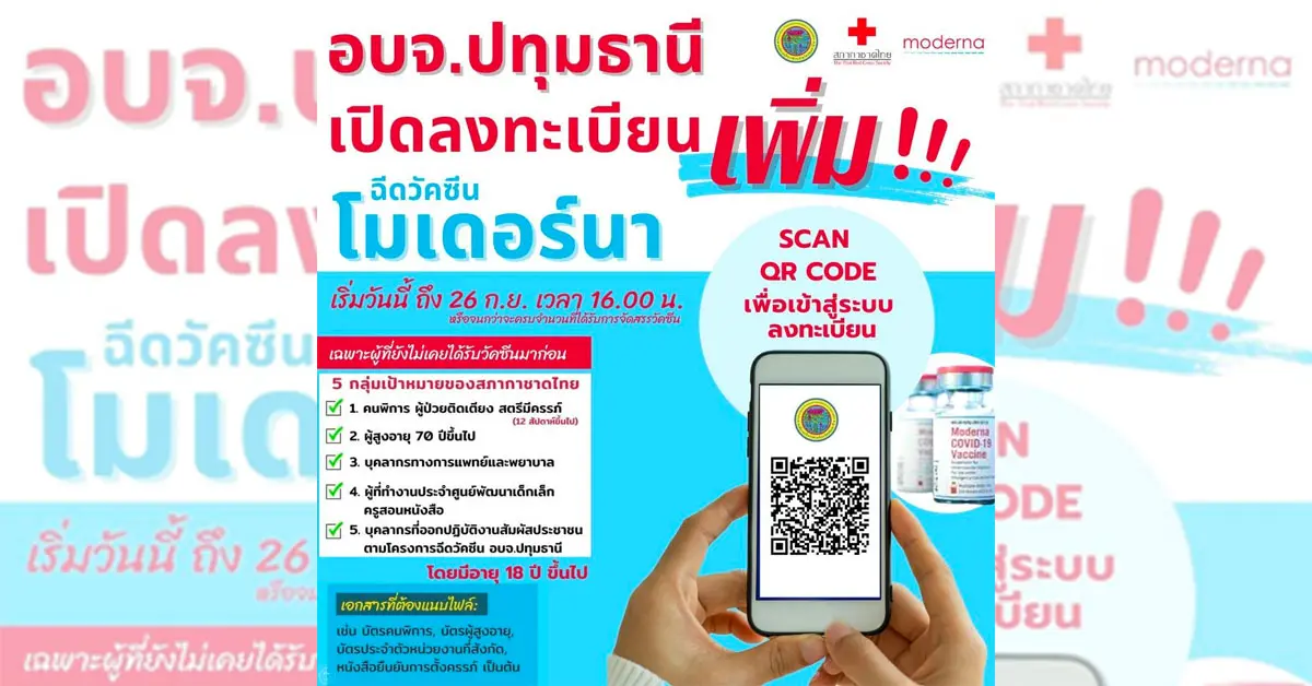 รีบเช็ก ก่อนเต็มโควต้า ด่วน! อบจ.ปทุมธานี เปิดลงทะเบียนจองวัคซีน “โมเดอร์นา” เพิ่มเติม 5 กลุ่มเป้าหมายที่สภากาชาดไทยกำหนด