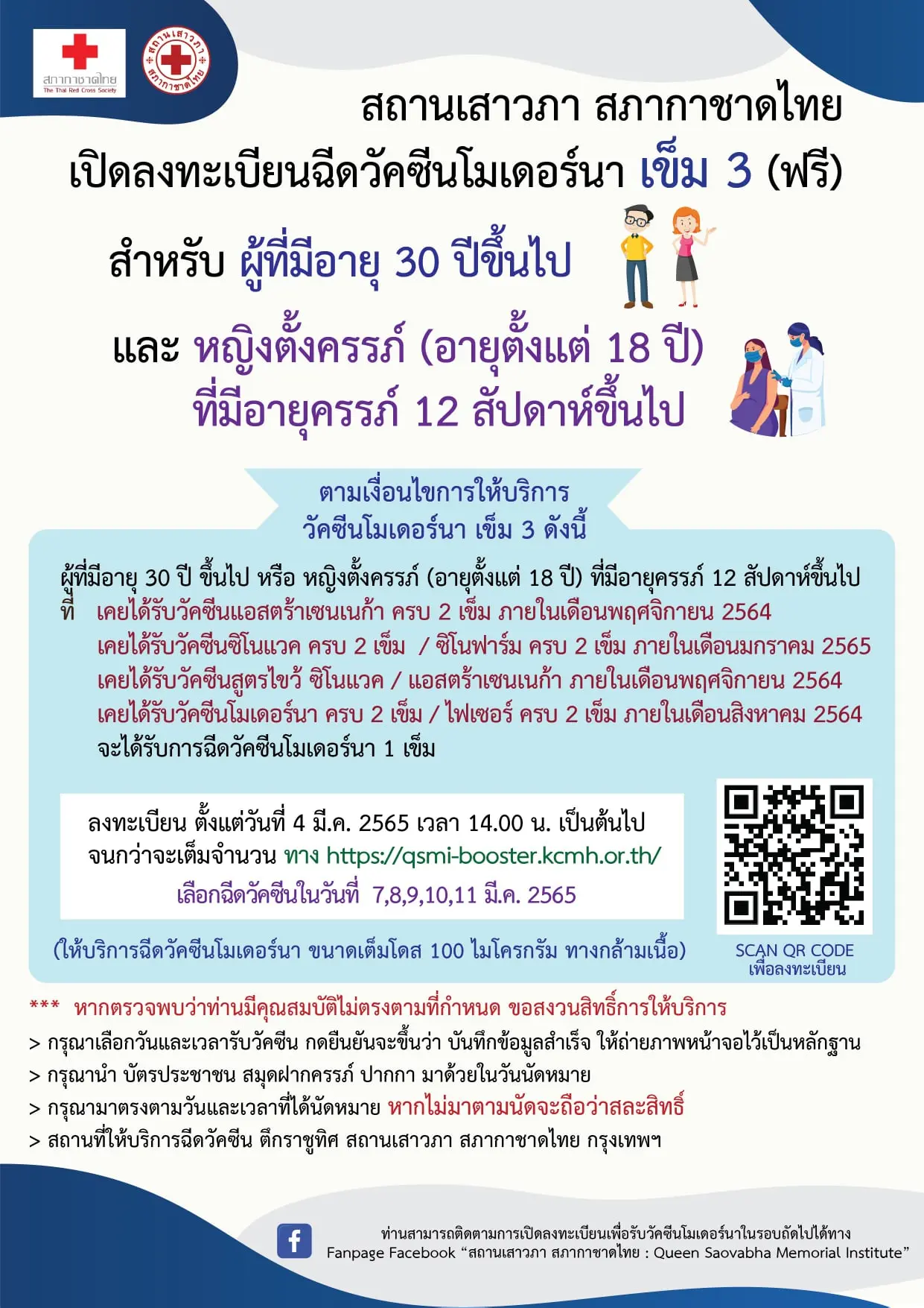 สถานเสาวภา สภากาชาดไทย ได้ประกาศเปิดลงทะเบียนรับวัคซีน โมเดอร์นา เข็ม 3 (ฟรี) โดยปรับลดเกณฑ์อายุเปิดลงทะเบียนในกลุ่มผู้ที่มีอายุ 30 ปี ขึ้นไป หรือ หญิงตั้งครรภ์ (อายุตั้งแต่ 18 ปี) อายุครรภ์ 12 สัปดาห์ขึ้นไป ตามเงื่อนไขการให้บริการวัคซีนโมเดอร์นาเข็ม 3 ดังนี้