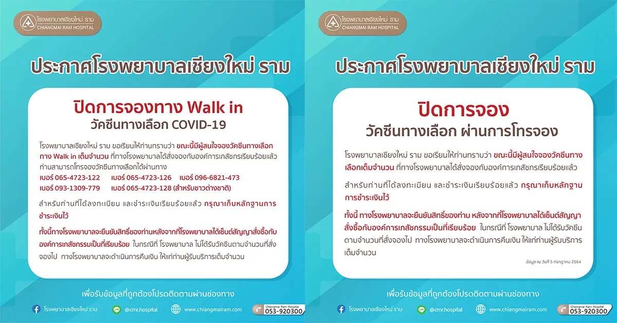 - ทางเพจโรงพยาบาล โรงพยาบาลเชียงใหม่ ราม Chiangmai Ram Hospital ออกมาประกาศปิดจองวัคซีน ทั้ง Walk in และ ผ่านทางโทรจอง