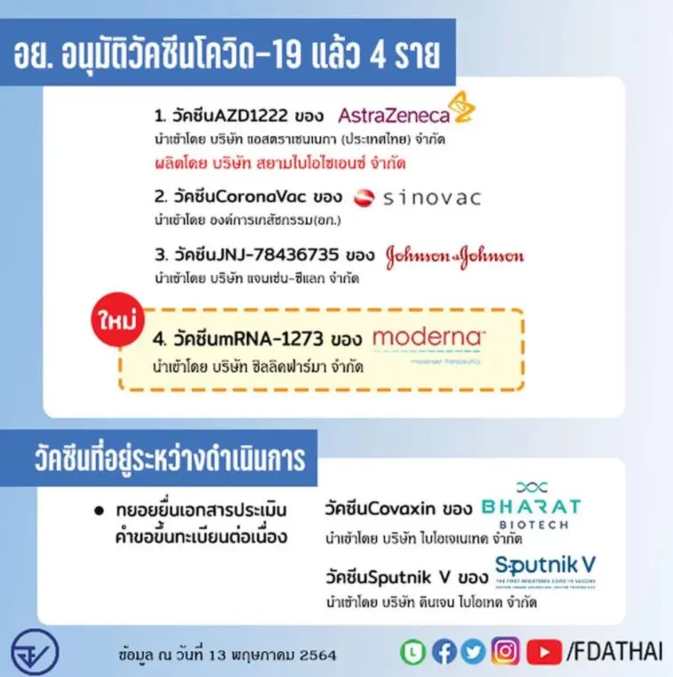 โดย อย. อนุมัติใช้ วัคซีน mRNA-1273 ของ Moderna นำเข้าโดย บริษัท ซิลลิคฟาร์มา จำกัด ผ่านการรับรองความปลอดภัย คุณภาพ ประสิทธิผล และได้รับการอนุมัติที่จะนำมาใช้ในไทย ลงวันที่ 13 พฤษภาคม 2564