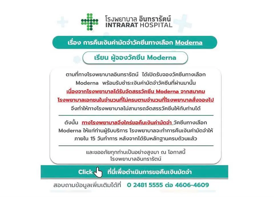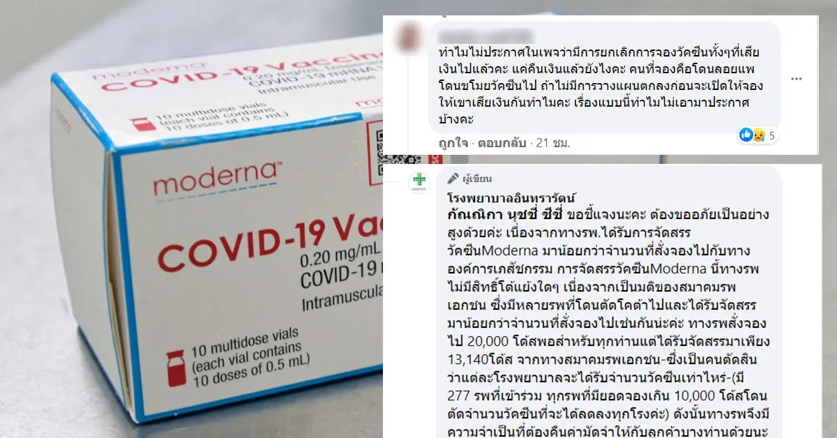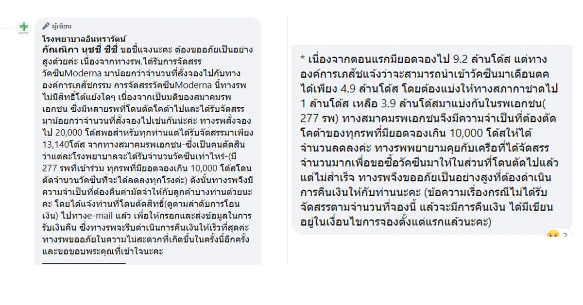 “ขอชี้แจงนะคะ ต้องขออภัยเป็นอย่างสูงด้วยค่ะ เนื่องจากทางรพ.ได้รับการจัดสรรวัคซีนModerna มาน้อยกว่าจำนวนที่สั่งจองไปกับทางองค์การเภสัชกรรม การจัดสรรวัคซีนModerna นี้ทางรพไม่มีสิทธิ์โต้แย้งใดๆ เนื่องจากเป็นมติของสมาคมรพเอกชน ซึ่งมีหลายรพที่โดนตัดโคต้าไปและได้รับจัดสรรมาน้อยกว่าจำนวนที่สั่งจองไปเช่นกันน่ะค่ะ ทางรพสั่งจองไป 20,000 โด้สพอสำหรับทุกท่านแต่ได้รับจัดสรรมาเพียง 13,140โด้ส จากทางสมาคมรพเอกชน-ซึ่งเป็นคนตัดสินว่าแต่ละโรงพยาบาลจะได้รับจำนวนวัคซีนเท่าไหร่-(มี 277 รพที่เข้าร่วม ทุกรพที่มียอดจองเกิน 10,000 โด้สโดนตัดจำนวนวัคซีนที่จะได้ลดลงทุกโรงค่ะ) ดังนั้นทางรพจึงมีความจำเป็นที่ต้องคืนค่ามัดจำให้กับลูกค้าบางท่านด้วยนะคะ โดยได้แจ้งท่านที่โดนตัดสิทธิ์(ดูตามลำดับการโอนเงิน) ไปทางe-mail แล้ว เพื่อให้กรอกและส่งข้อมูลในการรับเงินคืน ซึ่งทางรพจะรีบดำเนินการคืนเงินให้เร็วที่สุดค่ะ ทางรพขออภัยในความไม่สะดวกที่เกิดขึ้นในครั้งนี้อีกครั้ง และขอขอบพระคุณที่เข้าใจนะคะ”