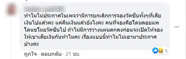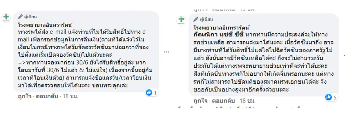 ต่อได้ได้รับเสียงตอบกลับจากผู้ใช้เฟสบุ๊กหลายหนึ่ง ในเพจเฟซบุ๊กของทางโรงพยาบาล ใจความว่า “ทำไมไม่ประกาศในเพจว่ามีการยกเลิกการจองวัคซีนทั้งๆที่เสียเงินไปแล้วคะ แค่คืนเงินแล้วยังไงคะ คนที่จองคือโดนลอยแพ โดนขโมยวัคซีนไป ถ้าไม่มีการวางแผนตกลงก่อนจะเปิดให้จองให้เขาเสียเงินกันทำไมคะ เรื่องแบบนี้ทำไมไม่เอามาประกาศบ้างคะ”