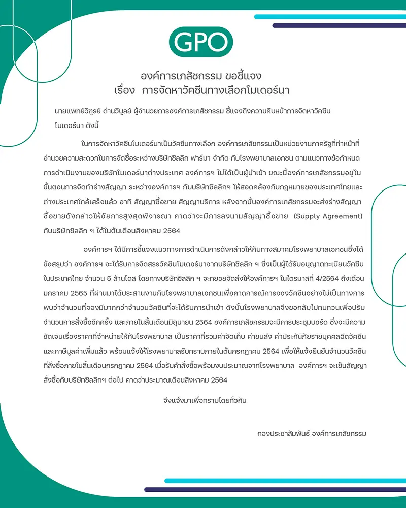 และแจ้งให้โรงพยาบาลรับทราบภายในต้นเดือนกรกฎาคม 2564 เพื่อให้แจ้งยืนยันจํานวนวัคซีนที่สั่งซื้อภายในสิ้นเดือนกรกฎาคม 2564 เมื่อรับคําสั่งซื้อพร้อมงบประมาณจากโรงพยาบาล องค์การฯ จะเซ็นสัญญา สั่งซื้อกับบริษัทซิลลิกฯ ต่อไป คาดว่าประมาณเดือนสิงหาคม 2564