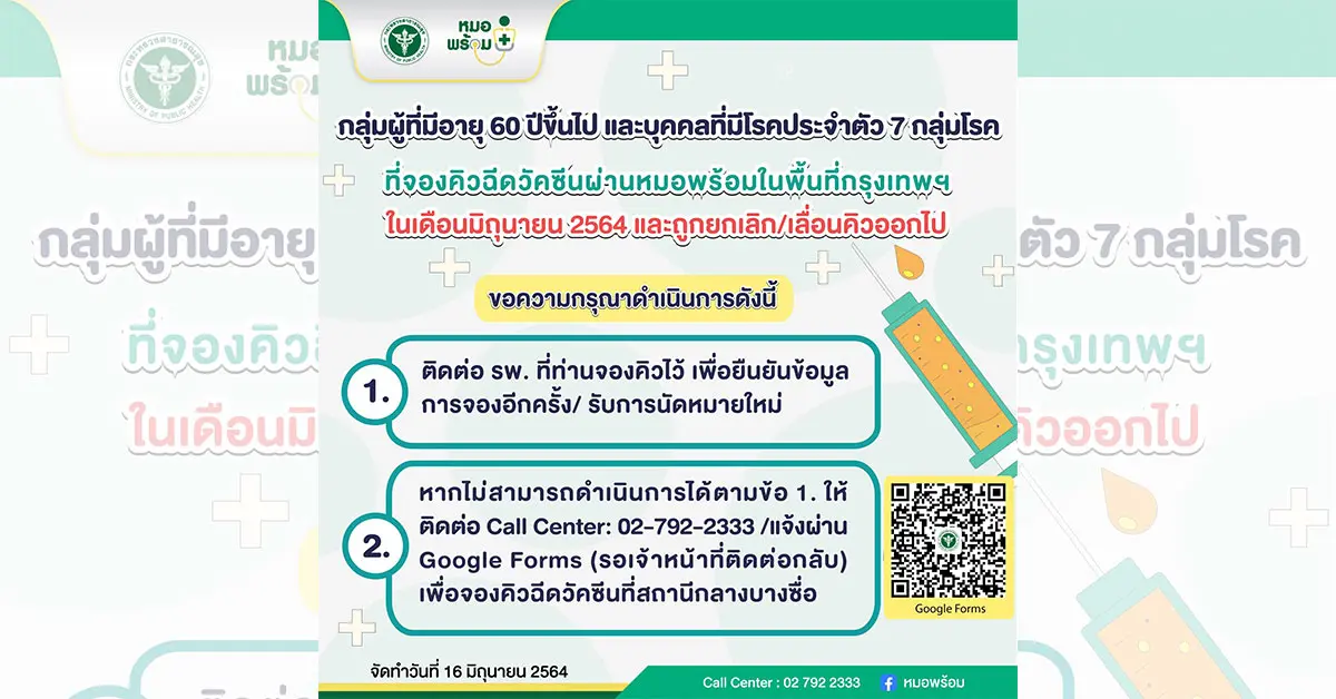 โดยล่าสุดเพจเฟซบุ๊กหมอพร้อม ได้เผย 2 วิธีการเยียวยาสำหรับ กลุ่มผู้สูงอายุ 60 ปีขึ้นไป และกลุ่ม 7 โรคเสี่ยง ที่ถูกเลื่อนนัดฉีดวัคซีนช่วงเดือนมิถุนายน 2564 หลังจากลงทะเบียนผ่านหมอพร้อม