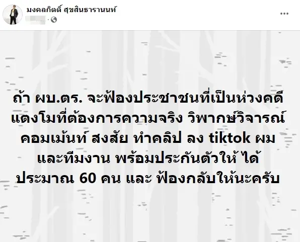 “ถ้า ผบ.ตร. จะฟ้องประชาชนที่เป็นห่วงคดีแตงโมที่ต้องการความจริง วิพากษ์วิจารณ์ คอมเม้นท์ สงสัย ทำคลิป ลง tiktok ผมและทีมงาน พร้อมประกันตัวให้ ได้ประมาณ 60 คน และ ฟ้องกลับให้นะครับ”