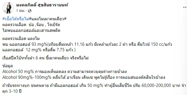 พบ แอลกอฮอล์ 93 mg%(เทียบดื่มเหล้า 11.16 แก้ว มีเหล้าแก้วละ 2 ฝา หรือ ดื่มไวน์ 150 cc/แก้ว แอลกอฮอล์ 12 mg% หรือดื่ม 7.75 แก้ว )