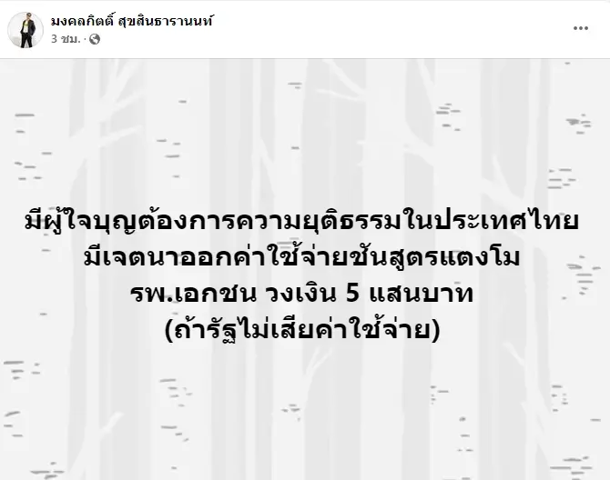 ล่าสุดวันที่12 มี.ค.65 นายมงคลกิตติ์ สุขสินธารานนท์ หรือ เต้ มงคลกิตติ์ ส.ส. หัวหน้าพรรคไทยศรีวิไลย์ ได้โพสต์ข้อความผ่านเฟซบุ๊ก มงคลกิตติ์ สุขสินธารานนท์ ระบุ “มีผู้ใจบุญต้องการความยุติธรรมในประเทศไทย มีเจตนาออกค่าใช้จ่ายชันสูตรแตงโม รพ.เอกชน วงเงิน 5 แสนบาท (ถ้ารัฐไม่เสียค่าใช้จ่าย) “