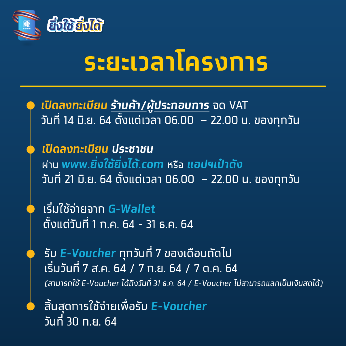 -รับ E-Voucherทุกวันที่ 7 ของเดือนภัดไป เริ่มวันที่ 7 .ส.ค.2564/ 7 ก.ย. 2564/ 7 ต.ค.2564 (สามารถใช้ E-Voucher ได้ถึงวันที่ 31 ธ.ค. 64 E-Voucher ไม่สามารถแลกเป็นเงินสดได้)