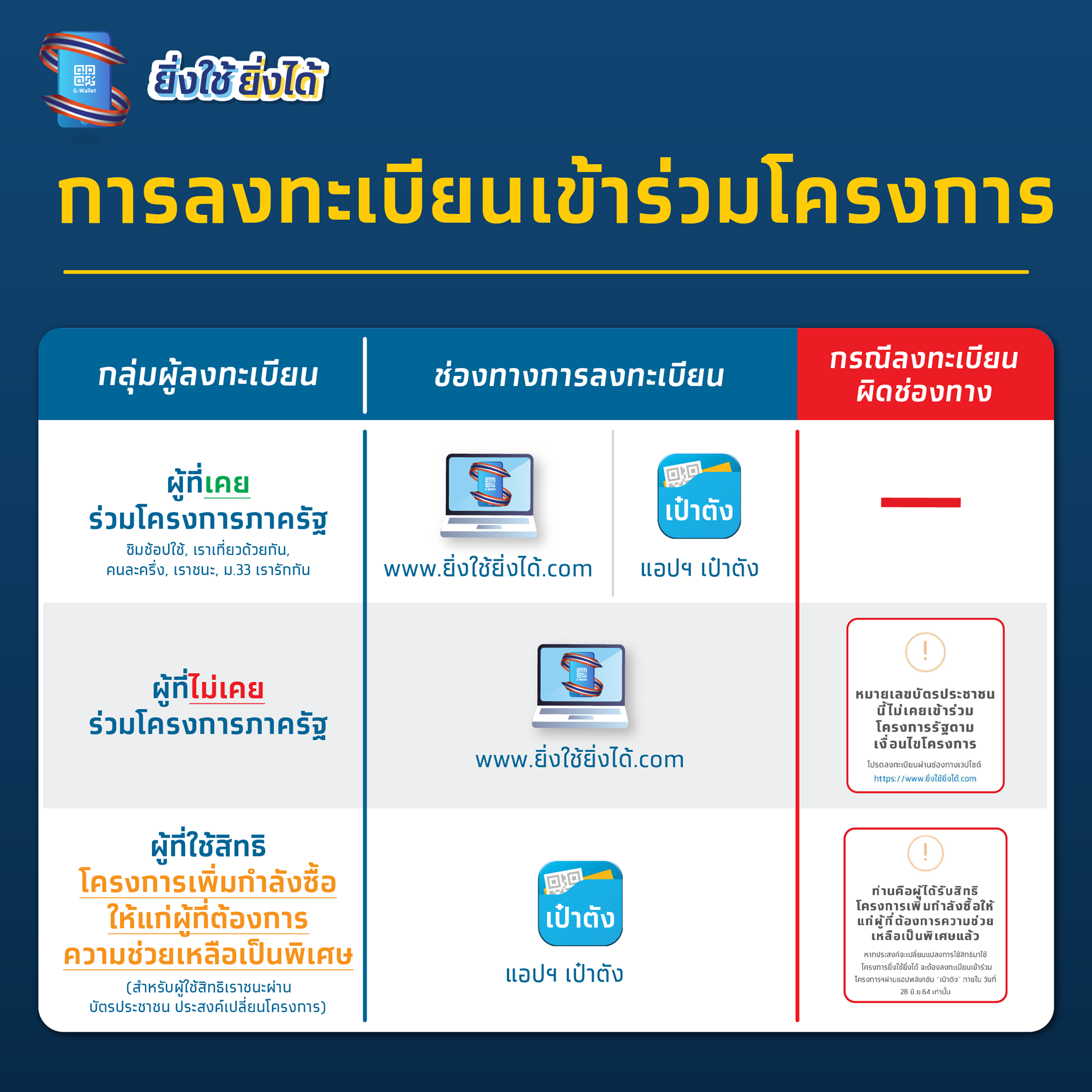 -กลุ่มผุ้ที่เคยร่วมโครงการภาครัฐ อย่างชิมช้อปใช้ เราเที่ยวด้วยกัน คนละครึ่ง เราชนะ ม.33เรารักกัน สามารถลงทะเบียนได้ทาง https://www.ยิ่งใช้ยิ่งได้.com/ และ แอปฯเป๋าตัง