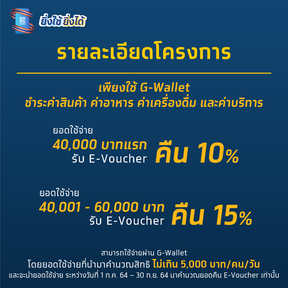 สามารถใช้จ่ายผ่าน G-Wallet โดยยอดใช้จ่ายที่นำมาคำนวณสิทธิ ไม่เกิน 5,000 บาท คน/วัน และจะนำยอดใช้จ่าย ระหว่างวันที่ 1 ก.ค.2564- 30 ก.ย.2564 มาคำนวณยอดคืน E-Voucher เท่านั้น