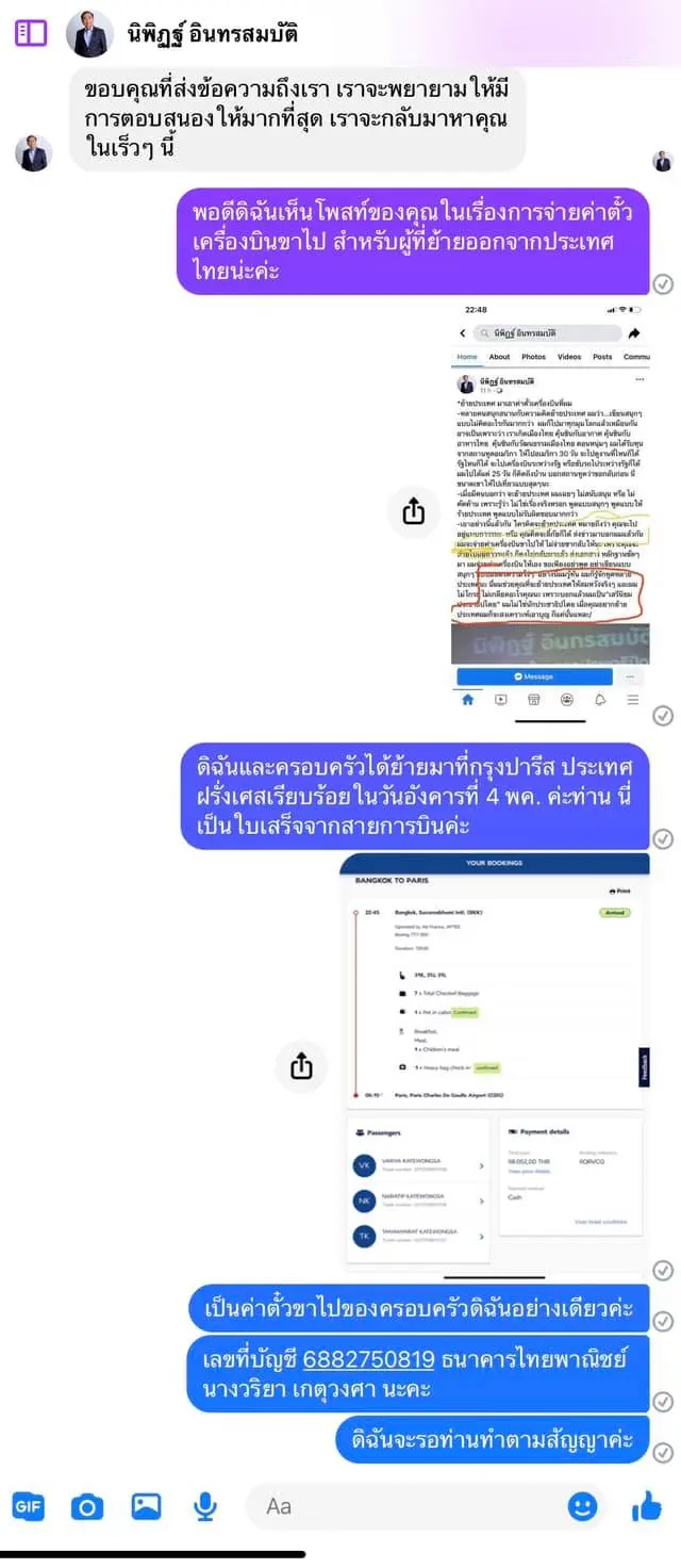 นอกจากนี้ยังมีอีก 1 ราย ที่ได้ย้ายครอบครัวไปอยู่ที่ต่างประเทศเมื่อวันที่ 4 พ.ค. เป็นที่เรียบร้อยแล้ว และได้ส่งข้อความเข้าไปขอความสนับสนุนเช่นเดียวกัน โดยได้ระบุข้อความว่า “พอดีดิฉันเห็นโพสต์ของคุณในเรื่องการจ่ายค่าตั๋วเครื่องบินขาไป สำหรับผู้ที่ย้ายออกจากประเทศไทยน่ะค่ะ ดิฉันและครอบครัว ได้ย้ายมาที่กรุงปารีส ประเทศฝรั่งเศสเรียบร้อย ในวันอังคารที่ 4 พ.ค. ค่ะท่าน นี่เป็นใบเสร็จจากสายการบินค่ะ เป็นค่าตั๋เครื่องบินขาไปของครอบครัวดิฉันอย่างเดียวค่ะ” พร้อมกับแนบหลักฐานการจ่ายเงินและเลขบัญชีธนาคารให้ด้วย