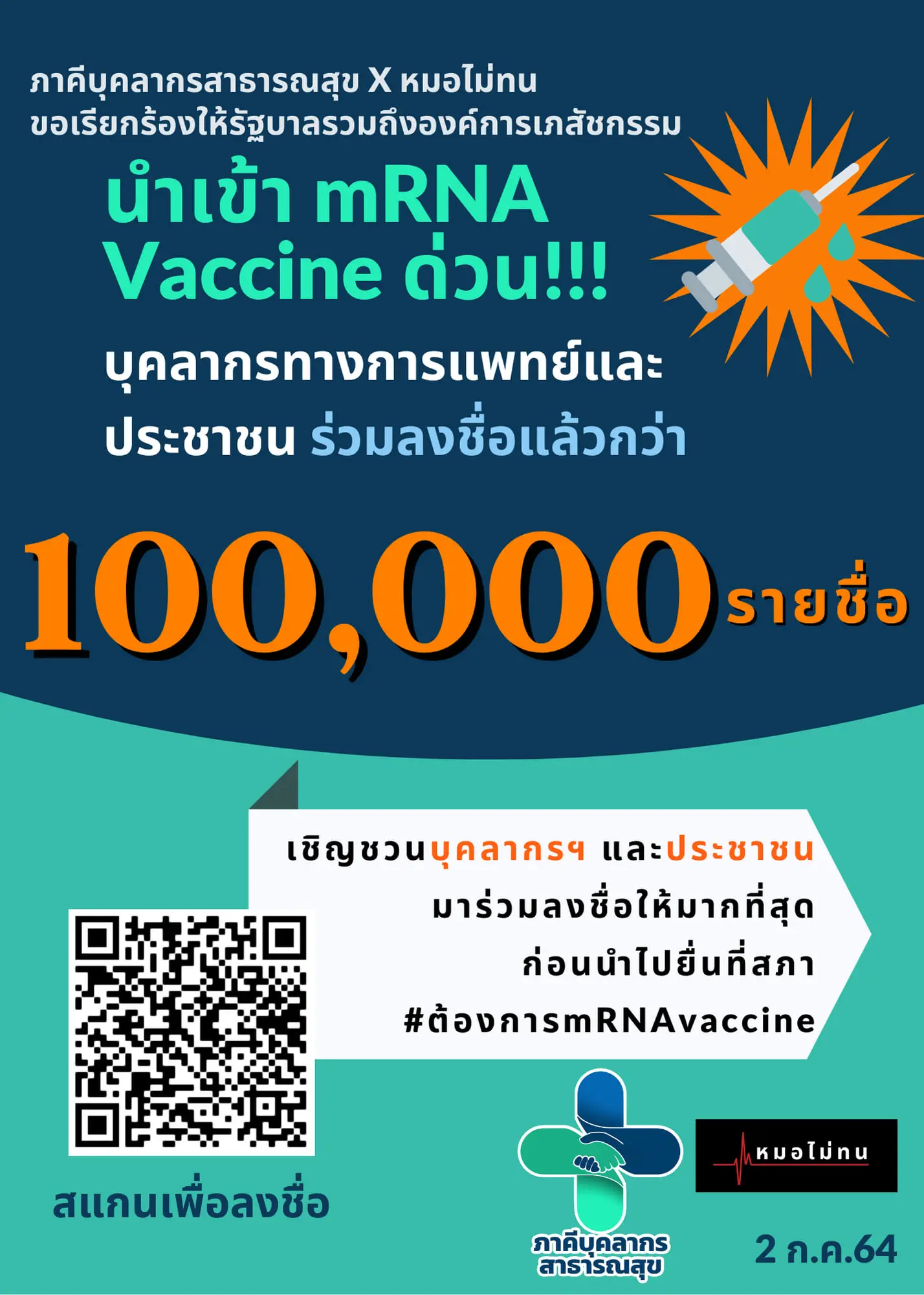 เมื่อวันที่ 3 กรกฎาคม ที่ผ่านมา ภาคีบุคลากรสาธารณสุข และหมอไม่ทน ได้เปิดเผยถึงการเรียกร้องต่อรัฐบาลรวมถึงองค์การเภสัชกรรม เร่งนำเข้า mRNA vaccine (Pfizer และ Moderna) ด้วยการรวบรวมรายชื่อของบุคลากรและประชาชนทั่วไปที่ขณะนี้รวบรวมได้แล้วกว่า 1 แสนรายชื่อ