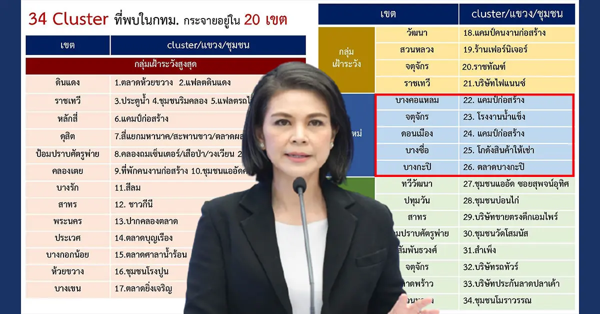 อัปเดทล่าสุด 34 คลัสเตอร์ รวม 5 คลัสเตอร์ใหม่ กระจาย 20 เขต กมท. กลุ่มเฝ้าระวังสุงสุดกว่า 17 คลัสเตอร์ เน้นคุมเข้มแคมป์คนงานก่อสร้าง