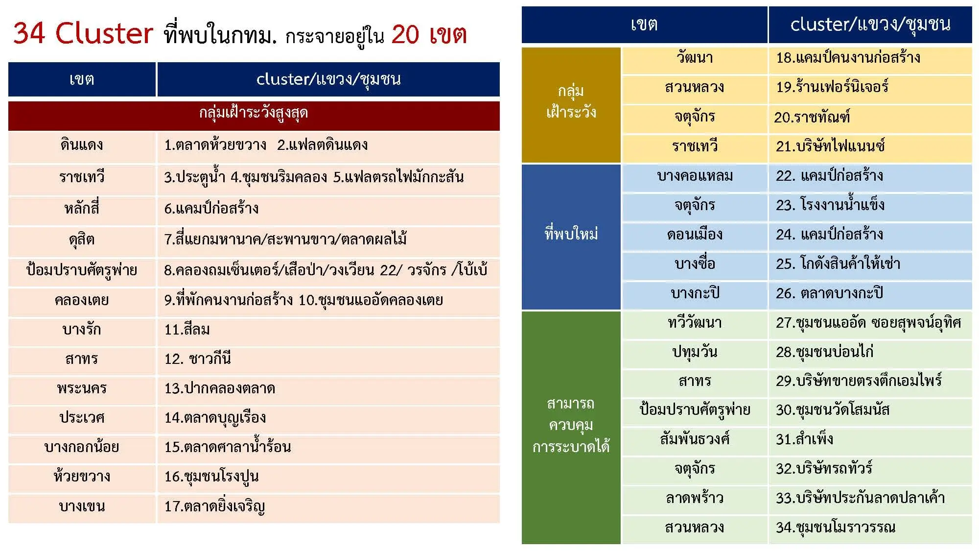 จำแนก 34 คลัสเตอร์ ใน 20 เขต กรุงเทพมหานคร ตามกลุ่มเฝ้าระวังดังนี้