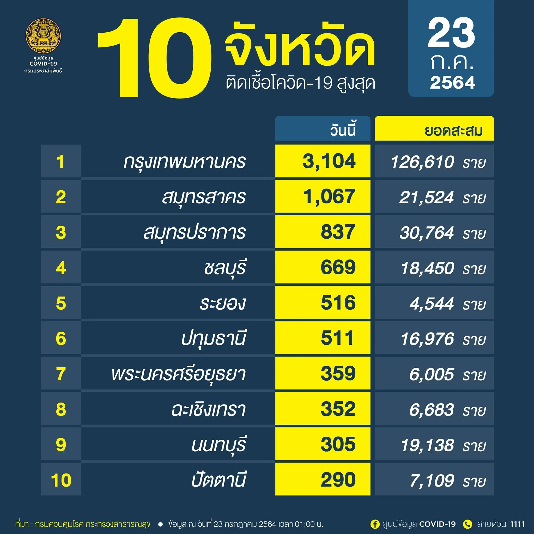 ส่วนในของจังหวัดที่พบผู้ติดเชื้อมากที่วุดในประเทศ กรุงเทพมหานคร ยังคงครองลำดับที่ 1 อย่างต่อเนื่อง วันนี้พบผู้ติดเชื้อ 3,104 ราย ตามมาด้วย สมุทรสาคร ติดเชื้อเพิ่ม 1,067 ราย ซึ่งเป็นจังหวัดที่น่าจับตามองเป็นอย่างมาก เนื่องจากจำนวนผู้ติดเชื้อพุ่งสูงขึ้นเลย อีกทั้งยังพบคลัสเตอร์อีก 2 แห่งในวันนี้ สืบเนื่องจากเมื่อวานที่ผ่านมาอีก 1 คลัสเตอร์