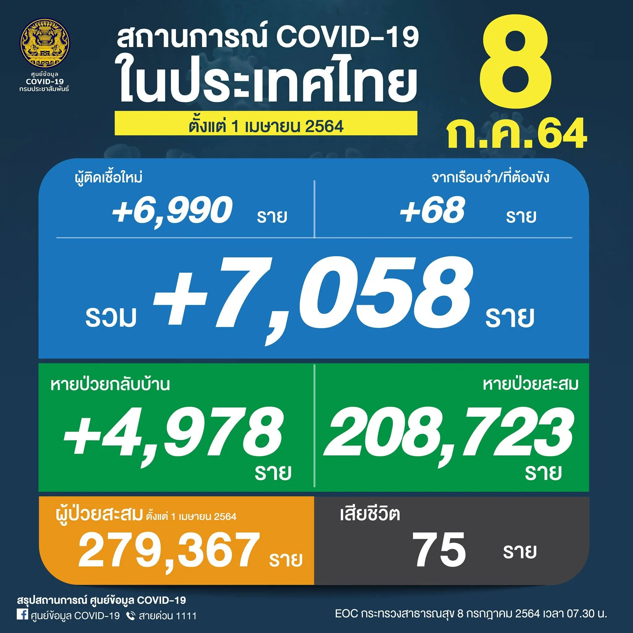 โควิดวันนี้ — เมื่อวันที่ 8 กรกฏาคม 2564 ศูนย์ข้อมูล COVID-19 รายงานยอดผู้ติดเชื้อ โควิด-19 โดยพบผู้ติดเชื้อรายใหม่เพิ่ม 6,990 ราย เสียชีวิต 75 ราย ทำให้การระบาดโควิด19 ระลอกใหม่ตั้งแต่เดือนเมษายน 2564 มียอดผู้เสียชีวิตรวม 2,368 ราย และยอดผู้เสียชีวิตสะสมจากการแพร่ระบาดของโควิด19 ตั้งแต่ปี 63 มีทั้งหมด 2,462 ราย สำหรับวันนี้มีรายงานผู้ติดเชื้อจากเรือนจำทั้งหมด 55 ราย รวมจำนวนผู้ติดเชื้อรายใหม่วันนี้ทั้งสิ้น 7,058 ราย