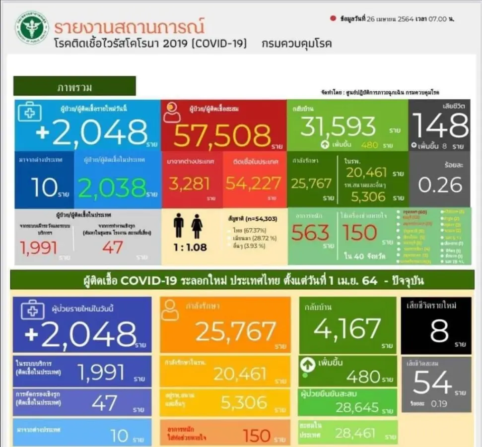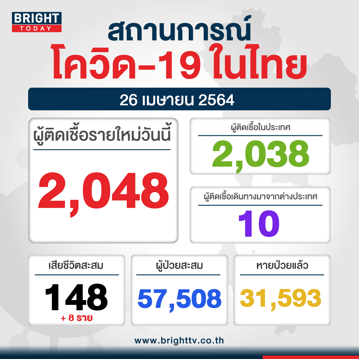 โควิดวันนี้ —- รายงานสถานการณ์โควิด ประจำวันที่ 26 เม.ย. 64 วันนี้ประเทศไทย พบจํานวนผู้ติดเชื้อโควิด-19 เพิ่มขึ้น 2,048 ราย ในจำนวนนี้เป็นผู้ติดเชื้อรายใหม่จากระบบเฝ้าระวังและระบบบริการ 1,991 ราย มาจากการค้นหาเชิงรุกในชุมชน 47 ราย และเป็นผู้ที่เดินทางมาจากต่างประเทศ 10 ราย ส่วนผู้ป่วยสะสมในเวลานี้มี 57,508 ราย