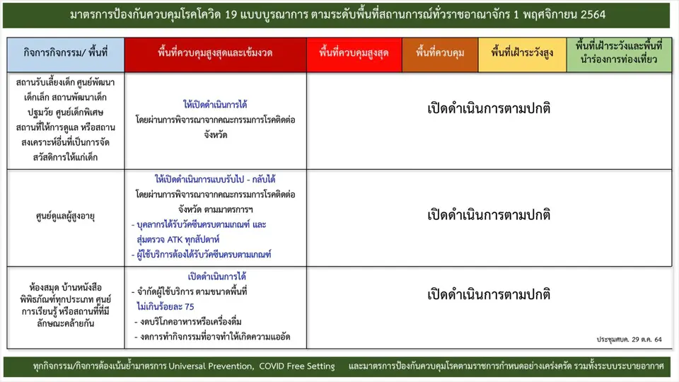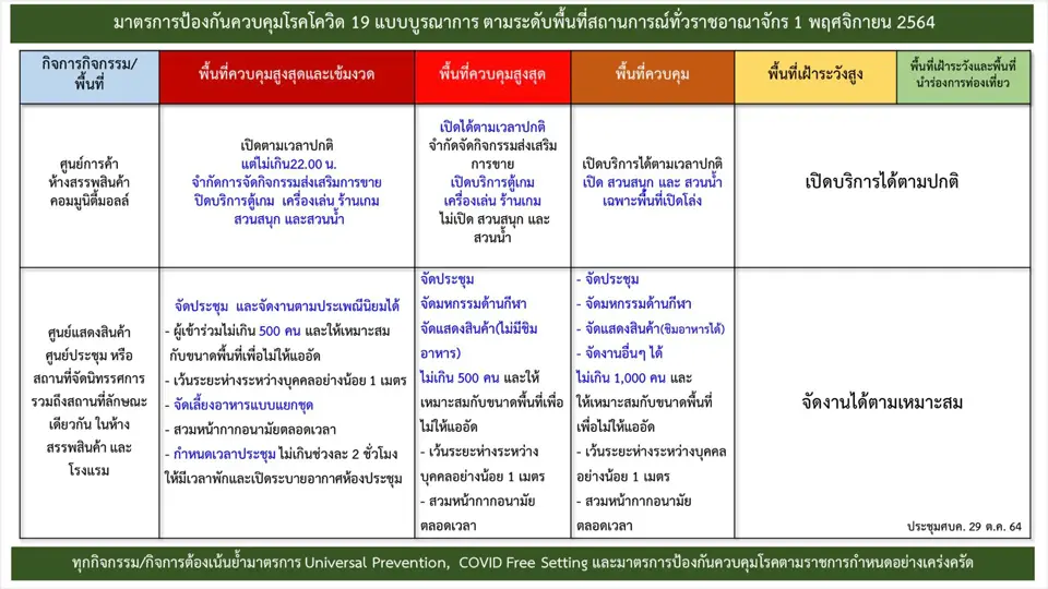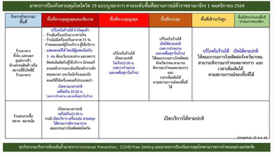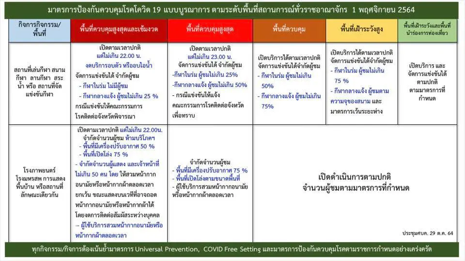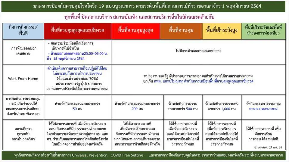 ปรับพื้นที่สีควบคุมใหม่ — ตามที่เมื่อวันที่ 12 พฤศจิกายน 2564 ในการประชุมคณะกรรมการบริหารสถานการณ์โควิด-19 (ศบค.) ครั้งที่ 18/2564 ที่มีพล.อ.ประยุทธ์ จันทร์โอชา นายกรัฐมนตรีและ รมว.กลาโหม ในฐานะผู้อำนวยการ ศบค.เป็นประธานได้มีมติเห็นชอบมาตรการปรับระดับพื้นที่สีตามสถานการณ์แพร่ระบาดโควิด19 ทั่วราชอาณาจักร ดังนี้