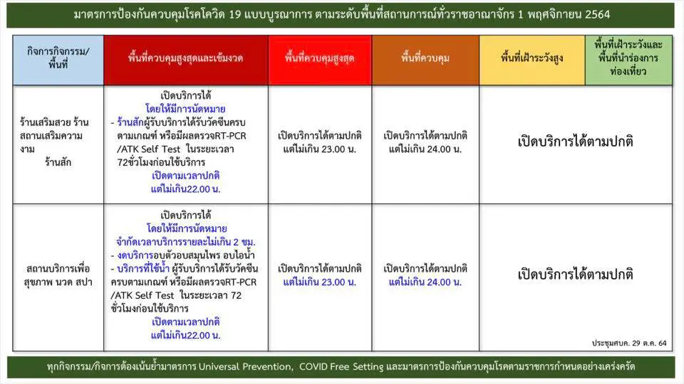 ขณะเดียวกัน ศบค.ยังมีมติให้คงปิด สถานบันเทิง ผับ บาร์ คาราโอเกะ และเห็นชอบเลื่อนการเปิดบริการจากแผนเดิมจากวันที่ 1 ธันวาคม 2564 เป็นวันที่ 16 มกราคม 2565 เพื่อเตรียมการ และประเมินสถานการณ์การระบาด และความครอบคลุมการได้รับวัคซีน แต่จะให้ดำเนินการเฉพาะพื้นที่เฝ้าระวังสูง, พื้นที่เฝ้าระวัง และพื้นที่นำร่องการท่องเที่ยวเท่านั้น ซึ่งมีความร่วมมือสูงและมีความเสี่ยงไม่มาก