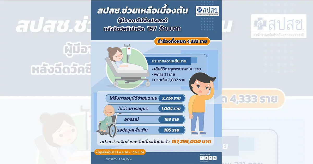 สปสช.เผย ช่วยเหลือเบื้องต้น ผู้ได้รับผลกระทบจากวัคซีนโควิดไปแล้วกว่า 3,224 ราย เป็นเงิน 157 ล้านบาท จังหวัดที่ยื่นคำร้องมากที่สุดคือ กทม.