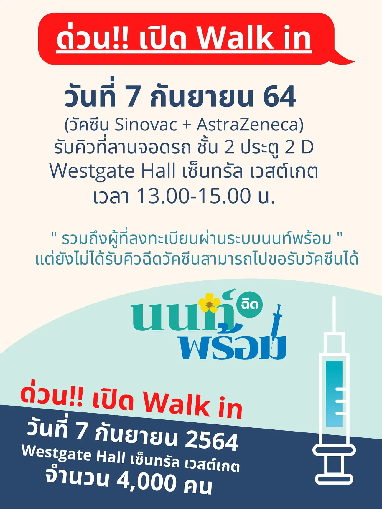 ทั้งนี้รวมไปถึงผู้ที่ลงทะเบียนผ่านระบบนนท์พร้อม แล้วแต่ยังไม่ได้รับการนัดหมายก็สามารถไปขอรับวัคซีนได้เช่นกัน ประชาชนสามารถตรวจสอบ รายละเอียดการขอรับวัคซีนแบบ Walk In เพิ่มเติมได้ที่ เฟซบุ๊ก สำนักงานสาธารณสุขจังหวัดนนทบุรี